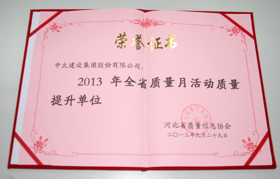 日前,中太建設集團被河北省質量信息協會評為“2013年全省質量月活動質量提升單位”。